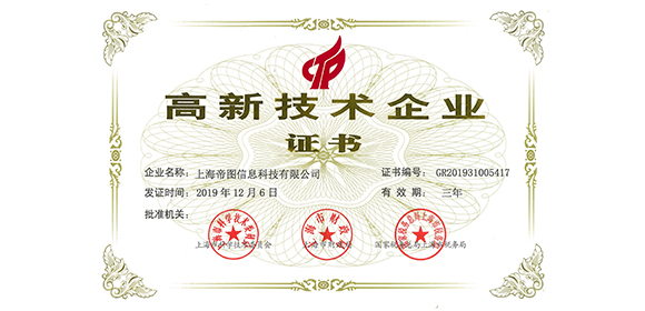 近期,帝圖科技到由上海市科學(xué)技術(shù)委員會,上海市財政廳,國家稅務(wù)局上海市稅務(wù)局頒發(fā)的“高新技術(shù)企業(yè)證書”。帝圖科技首次獲得國家高新技術(shù)企業(yè)殊榮是對公司堅持自主研發(fā),持續(xù)自主創(chuàng)新的有力證明。