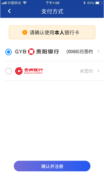點(diǎn)擊【確認(rèn)并注冊(cè)】選擇本人支付方式,若選擇非本人支付方式會(huì)導(dǎo)致開(kāi)通失敗哦。